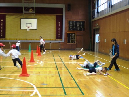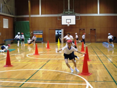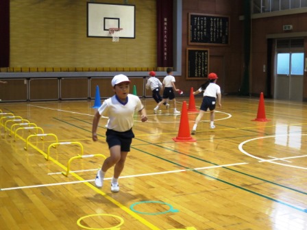 4月24日(火)3・4年体育の授業風景です。雨で体育館での学習でしたが、用具を置いて工夫された場で運動量の多い学習をしていました。走る・跳ぶ・転がるなどの運動を力いっぱい楽しく頑張っていました。