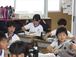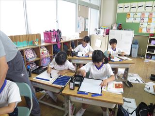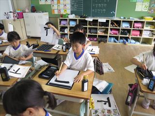 3年生教室では、子どもたちが真剣な表情で「下」という字を書いていました。毛筆を初めて学習して「一」を書きました。そして今日は「下」を書けるまでレベルアップしています。とても楽しそうに、真剣に書くことができました。
