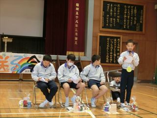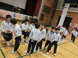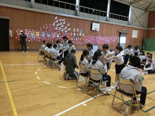 3月9日、6年生を送る会を体育館で行いました。この日はとても寒く、体育館は底冷えがしましたが、子どもたちの熱気でそんなことは感じない日となりました。