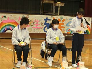 6年生の入場、みんなでのゲーム、各学年の出し物とプログラムは続きます。1年生は6年生誰でしょうクイズ・鍵盤ハーモニカでした。2年生は恋ダンス・メッセージ、3年生は6年生誕生日占い、4年生はハンドベル・6年生なぞかけ、5年生はカレンダークイズでした。どの学年もお世話になった6年生への感謝の気持ちがあふれる出し物でした。プレゼントもありました。そして6年生からは、在校生へメッセージがありました。自分の体験をもとにした、とても貴重なものでした。在校生は水を打ったように静かに聞きました。最後にアーチで6年生を送り出した在校生は、とても満足そうでした。また、今日の司会進行をしてくれた5年生は、片付けまできびきびと動き、とても頼もしかったです。
