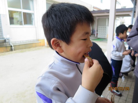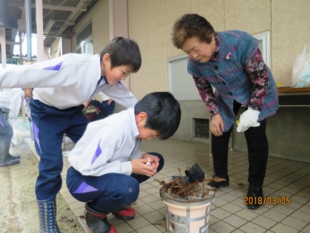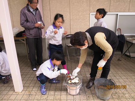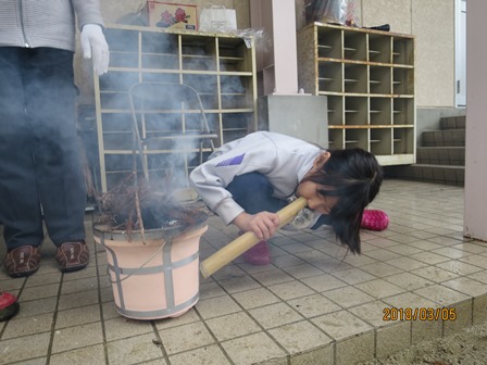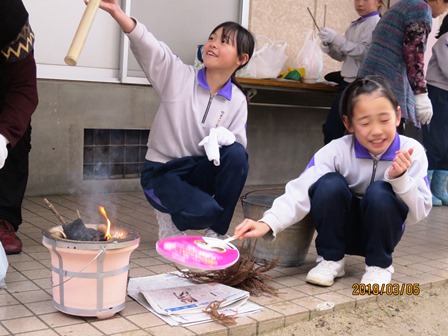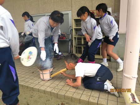 3月5日(月)今日は3年生が社会科「昔の暮らし」の学習で火おこし体験をしました。長寿会の4名の方に教えていただき、マッチで火をつけることからはじめました。マッチは初めてという子もいて苦戦していましたが、火をつけてからは、うちわや火吹き竹で風をおくって上手におこしていました。お餅やスルメを焼いて食べると「炭で焼くとおいしい。」と嬉しそうに話していました。最後の片付けも上手にしてひおこし体験が終了しました。