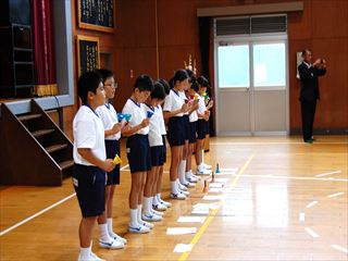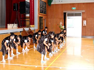 もう一つは4年生の学区の敬老会への参加です。4年生が毎年、運動会での踊りや音楽などを披露しています。今年は9月18日(日)に行われました。今年の4年生はハンドベルで6曲披露した後、「よさこいソーラン」を踊りました。ハンドベルの軽やかな音色と元気のよい踊りで会場に元気さを届けることができたと思います。また自己紹介では自分の地区名なども紹介し、顔と名前をしっかり覚えていただくことができました。4年生には、この活動もボランティアになることを知ってもらえたらと、思います。