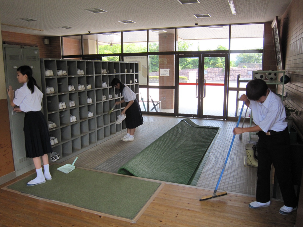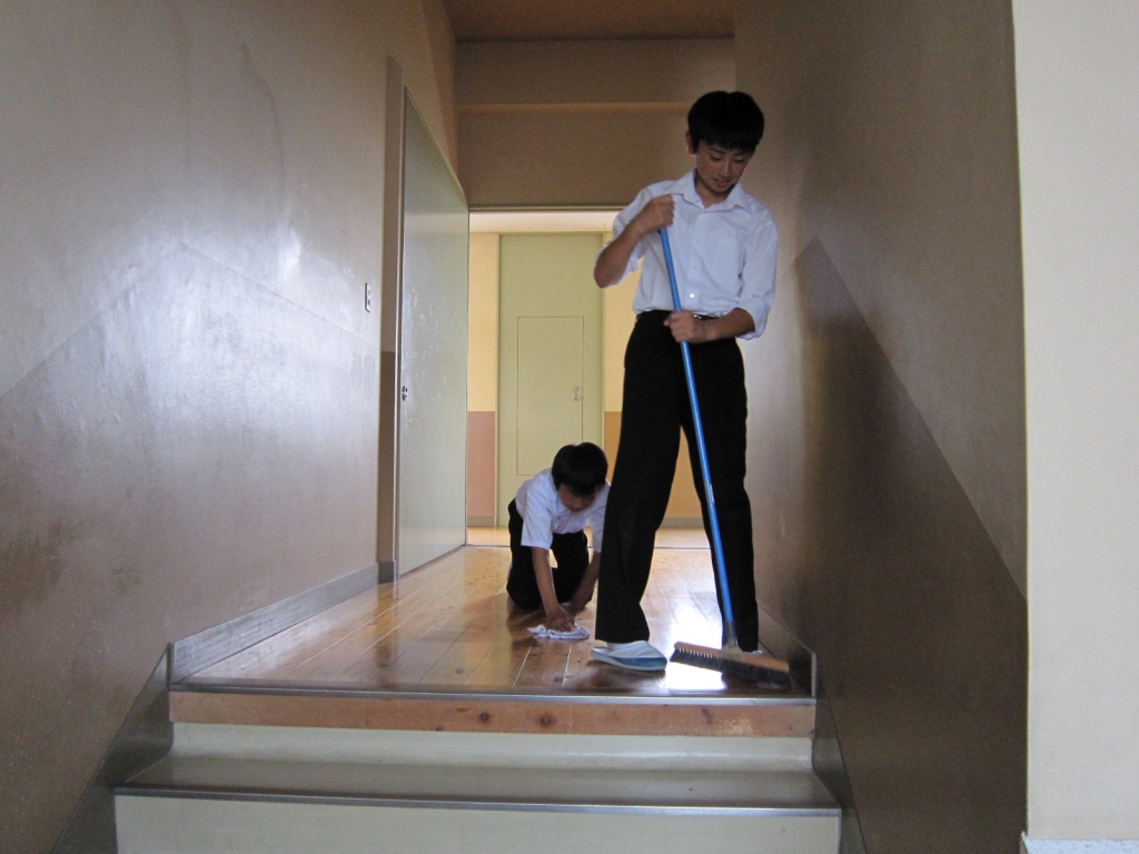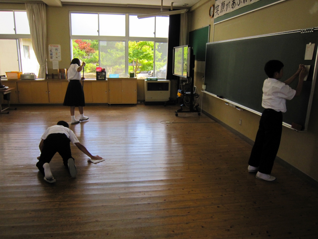 今回は,生徒の掃除の様子を載せました。どの学年も時間通りに始め,分担場所の掃除に一生懸命に取り組んでいます。教室の数も多く廊下も長いので,一人あたりの分担はかなりあるのですが,何とか時間内に終えることができています。