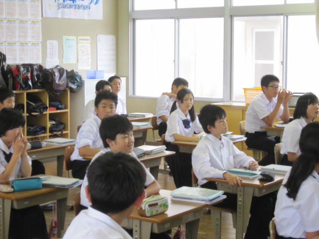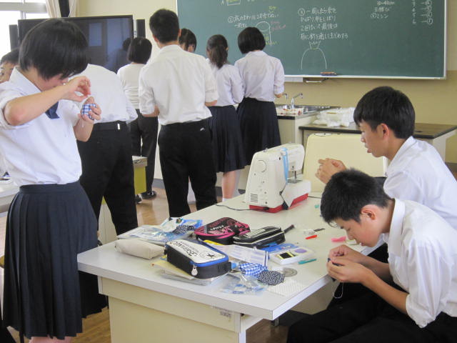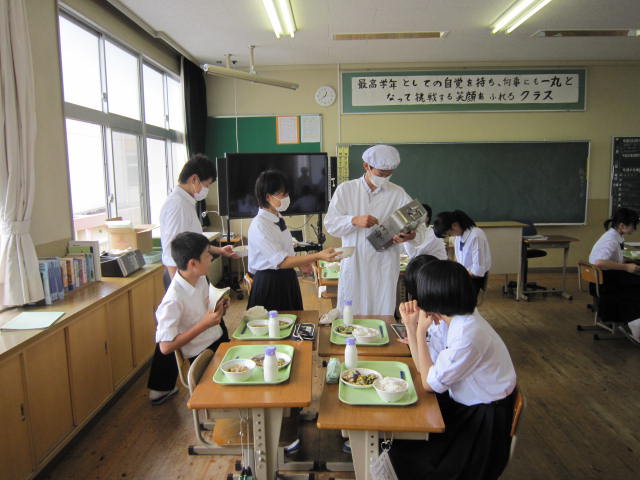 授業風景と給食準備の風景を載せました。1年生は技術の時間に立体図の書き方の基礎を学習しました。2年生は家庭科の時間に1日に必要な摂取エネルギーについて学習しました。3年生は家庭科で針と糸を上手に操り,お手玉づくりに挑戦しました。どの授業も生徒の真剣な顔つきが印象的でした。