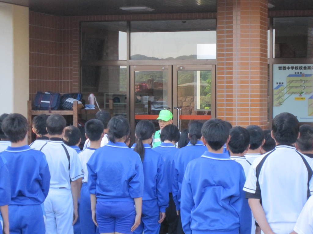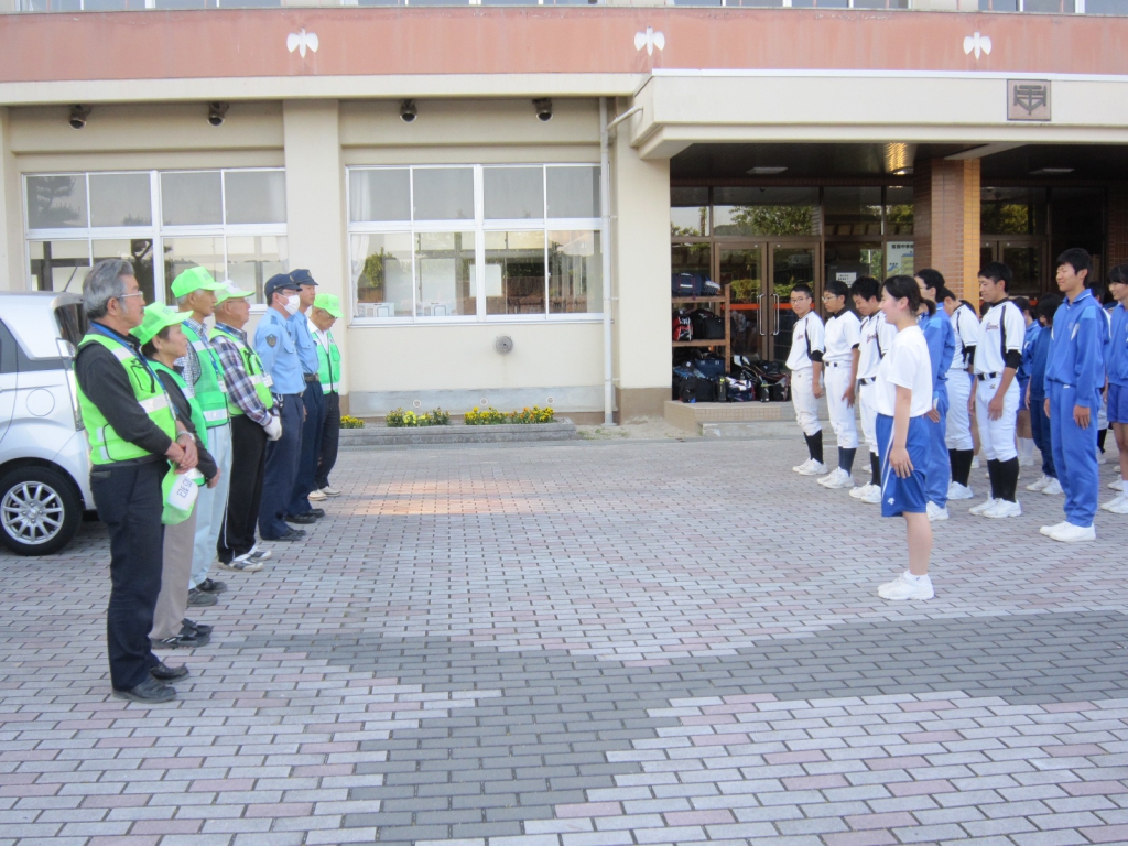 今年も生徒の登下校の見守りでお世話になっている哲西地域安全会のみなさんとの対面式を行いました。また,この日新見警察署野馳駐在所の秋山さん同矢神駐在所の石原さんにも出席していただき,お話をしていただきました。交通事故や不審者との遭遇といった事案がなく,安心して安全に学校生活が送れることを願っています。