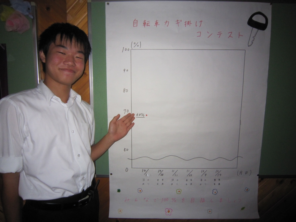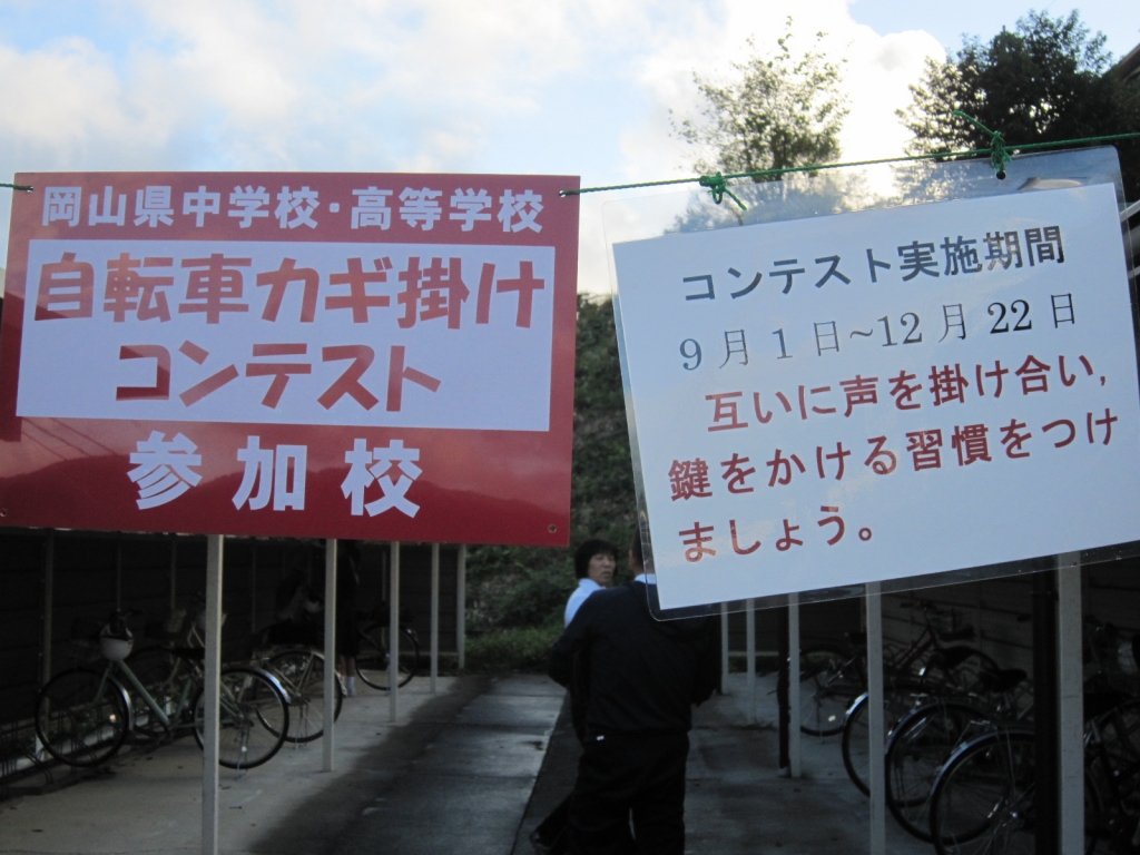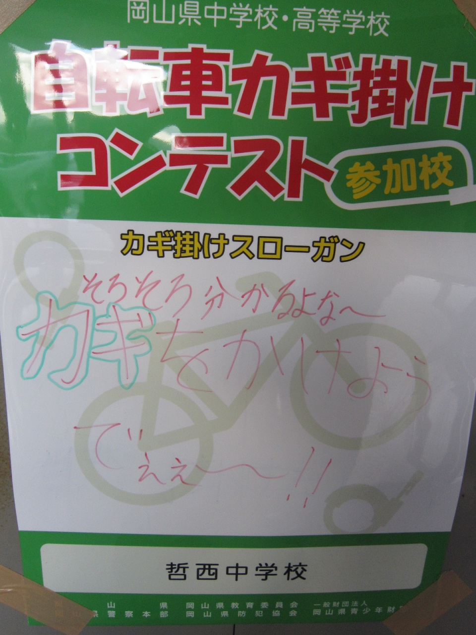 9月1日~12月22日まで,新見警察署生活安全課の主催事業である「自転車鍵かけコンテスト」に参加しています。この運動は,生徒たちの防犯意識の向上と自分の所有物は自分で守る習慣を身につけることを狙いとしています。哲西中では,旧執行部(清水さん,生原君,西川さん,有家君)が呼びかけのスローガンの掲示や鍵かけの実施率の集計など啓発活動に一生懸命取り組んでくれています。