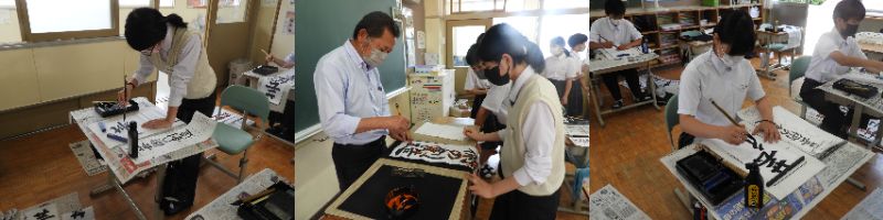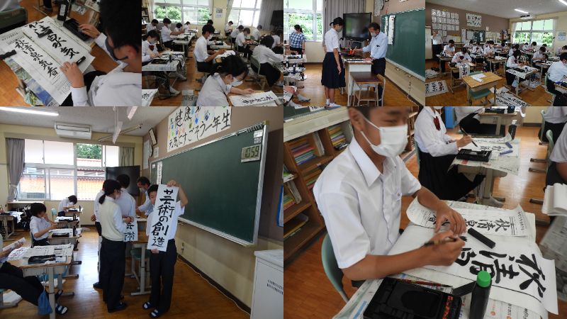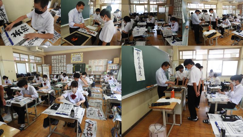哲多中学校の伝統ともなっている書道教室を清水鶴明先生をお迎えして、今年度も開催しました。岡山県児童生徒書道展への出展へ向け、7月3日から3日間、それぞれの教室で全校生徒が2時間書道に取り組みました。今年の課題は、1年生が『芸術の創造』・2年生が『科学の発達』・3年生が『秋清泉気香』でした。清水先生に出来上がった作品を指導していただき、2時間みっちり集中して取り組んだ結果、かなりの生徒が上達し見事な作品が書き上げられました。