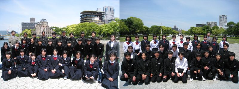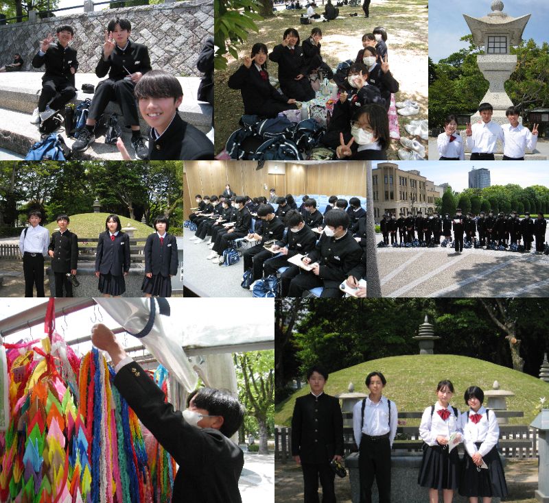 【広島平和学習】5月12日(金)、2年生は広島平和学習を行いました。晴天の下、広島に到着すると脇舛友子先生から被爆体験の講話をしていただきました。生徒たちの一言一句聞き逃すまいとしっかりとメモをとる姿が印象的でした。次に、原爆の子の像前で平和集会を行いました。代表生徒の平和宣言が、心にしみわたりました。美味しいお弁当を食べて原爆資料館を見学しました。その後、班別で公園内を散策しました。平和についてしっかりと考えることができた1日となりました。
