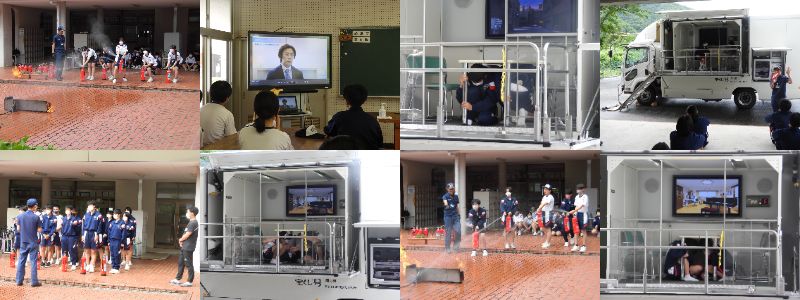 6月14日(水)に、新見消防署から3名の方をお迎えし、起震車体験と消火器体験を行い、震災と火災についてのDVD視聴を行いました。起震車体験では、地震が起きた時の身の守り方について、実際に震度6強の揺れを体験しながら学びました。強い揺れの中でも机の脚にしっかりしがみつき、頭を守ることができました。消火器体験では、実際の炎に向かって水消火器で消火活動を行いました。「火事だー!」の掛け声の後、速やかに消火することができていました。 実際に災害が起きた時にも、今日のように落ち着いて身を守ってください。