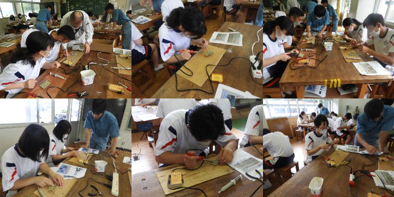 まず始めに湯浅先生から、はんだ付けの説明をしていただきました。その後、生徒たちは、配線やLED・IC回路のはんだ付けに苦労していましたが、高校生に手伝ってもらうなどして全員が時間内に全ての作業を終えることができました。そして、スイッチを入れ、全てのLEDが点灯した瞬間は、『オーー』という中学生の歓声が上がりました。