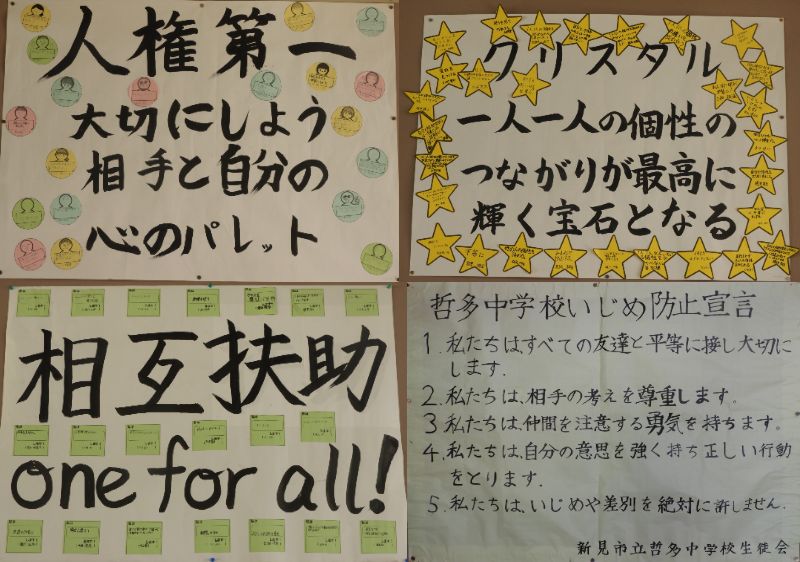 先日のいじめについて考える集会で各クラスの代表者が発表した人権目標を掲示しています。来月の教育懇談でご覧ください。