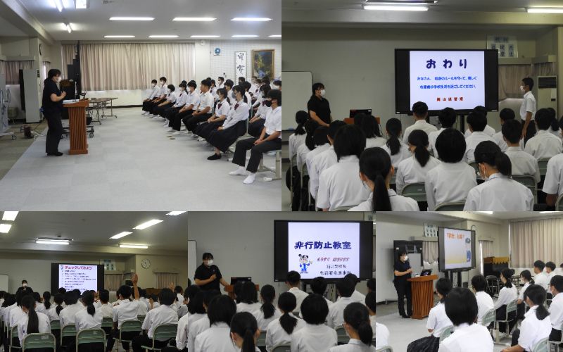 警察署の方からは、非行に関する事案をクイズ形式でスライドを使って分かりやすく説明していただきました。生徒たちは、SNSでの誹謗・中傷も侮辱罪などの犯罪になることについて興味深く聞いていました。この機会を通して明日から始まる夏休みは健康で安全な生活を送ってほしいと願っています。